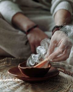 聖木條需使用明火點燃,明火需停留一會讓祂稍微燒透才能點上,點燃後停留約30秒左右即可吹熄明火,會產生白色煙霧,香味會散出。淨化空間及物品可順時鐘薰香一圈。聖木燃燒時間不會太久就會熄滅,若有需要可重複點燃。若不想重複點燃建議可使用聖木線香或塔香。