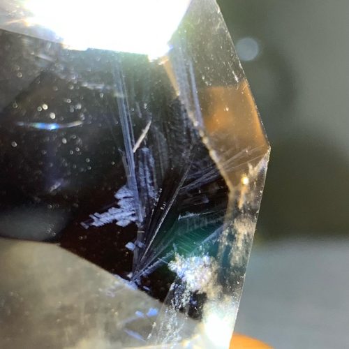 藍針水晶的針狀與絮狀內含物來自於靛藍碧璽的微狀結晶,也有一說是由內部細微裂縫所造成的。在白水晶中看起來就像是一片片藍色羽毛飄落,被說是天使之翼,具有很強的能量。