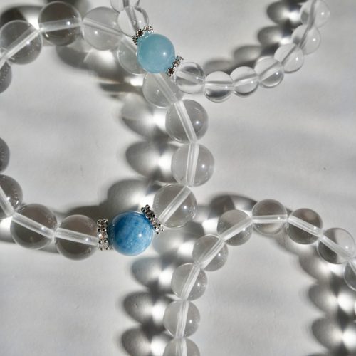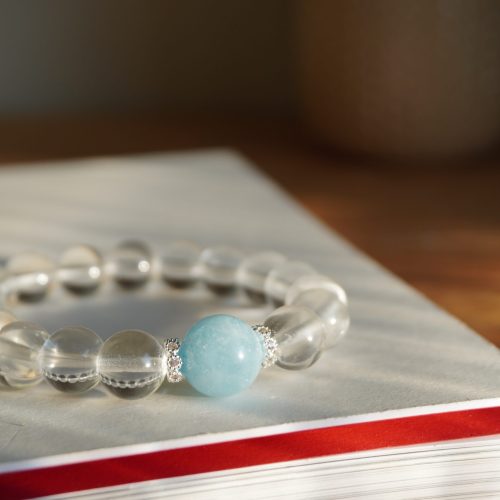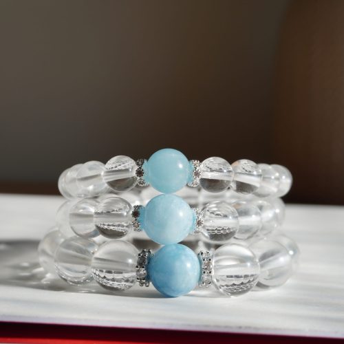 選用全淨體高純淨的白水晶圓珠搭配海藍寶主珠,搭配銀色間隔珠,簡約卻不失細節。無論你正走在療癒旅程上,或只是渴望一份寧靜,它都像是一位默默守護的靈性朋友,靜靜為你開展更高頻的日常。